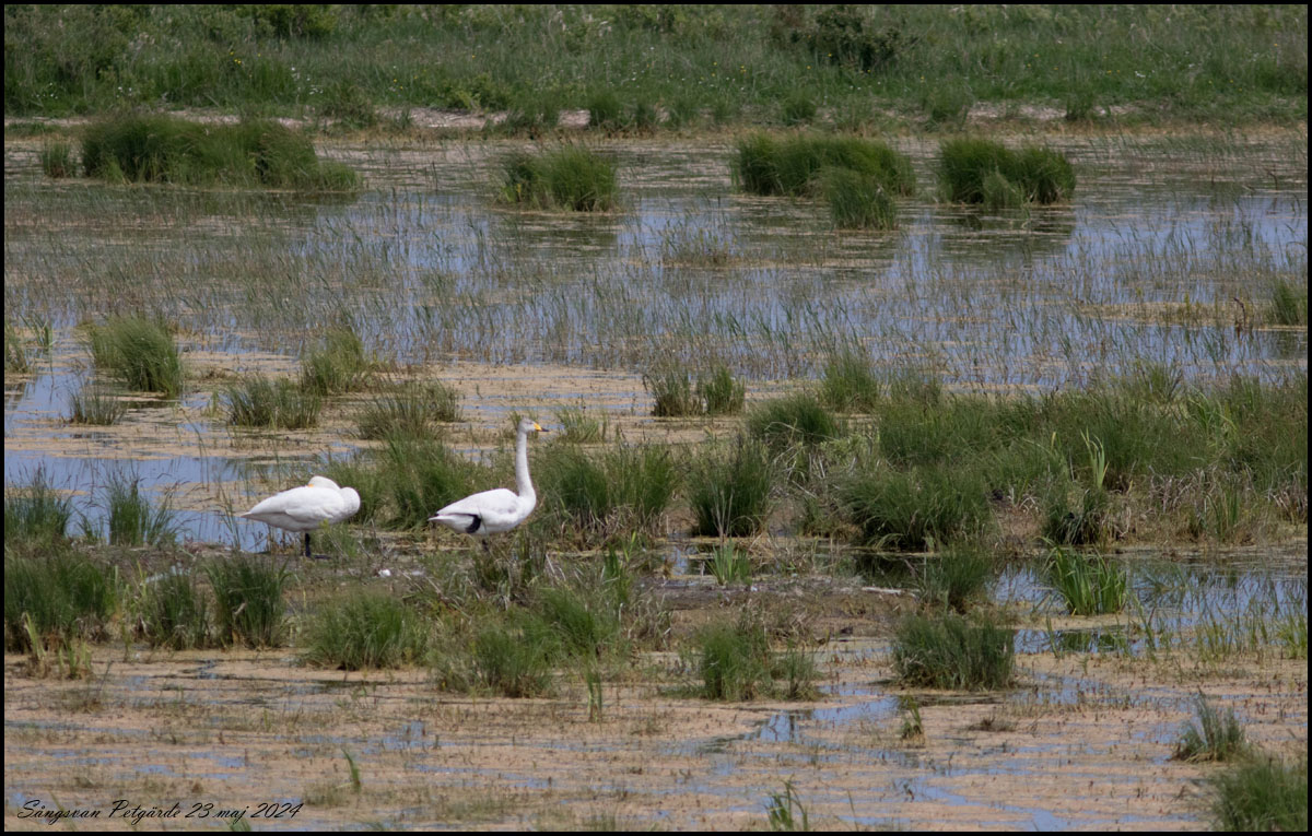 | Sångsvanar vid Petgärde träsk. En del vatten finns kvar i sjön. |
