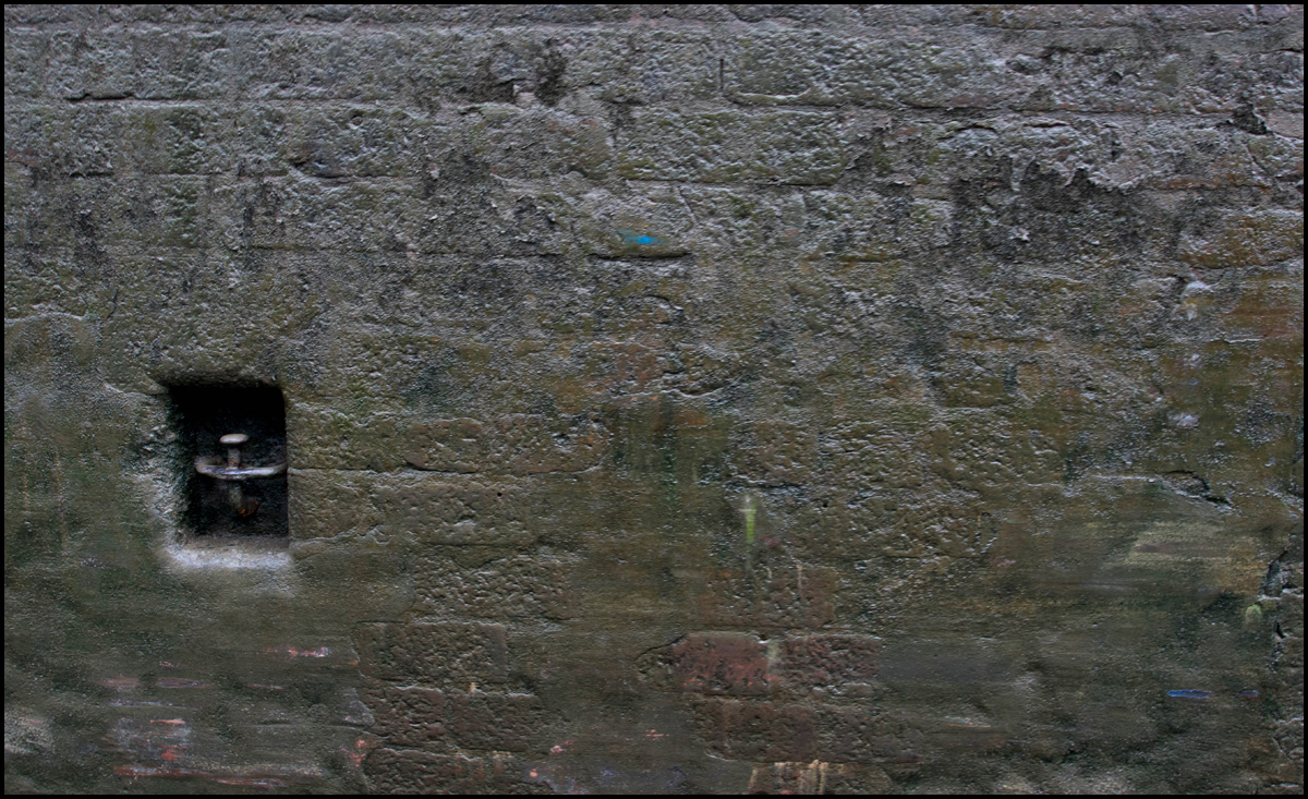 | Rost, alger och avskrapad målarfärg på slussväggen. | |