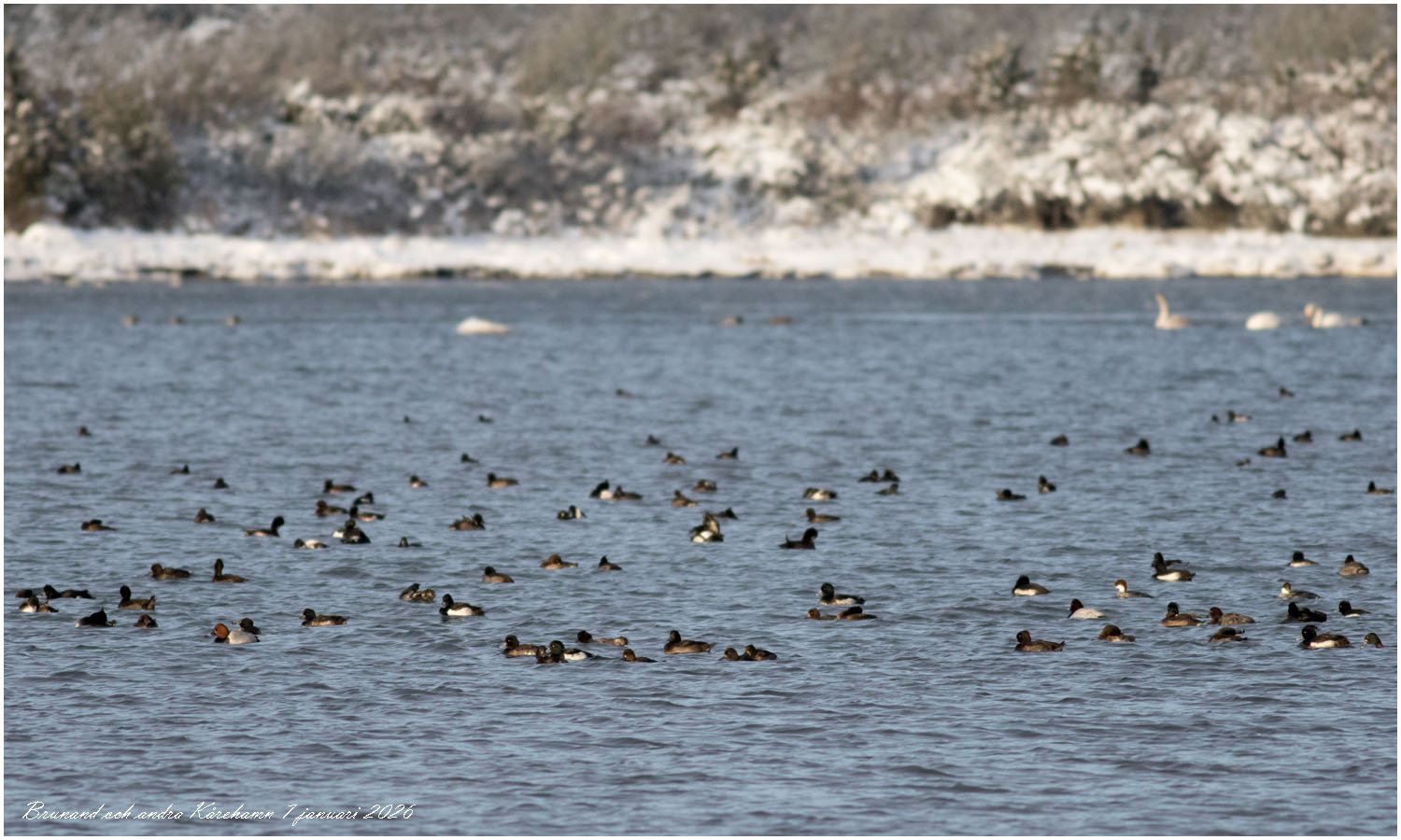 | 7 januari. Kårehamn bjuder varje vinter på många sjöfåglar. Mest är det vigg men också brunand och salskrake. |