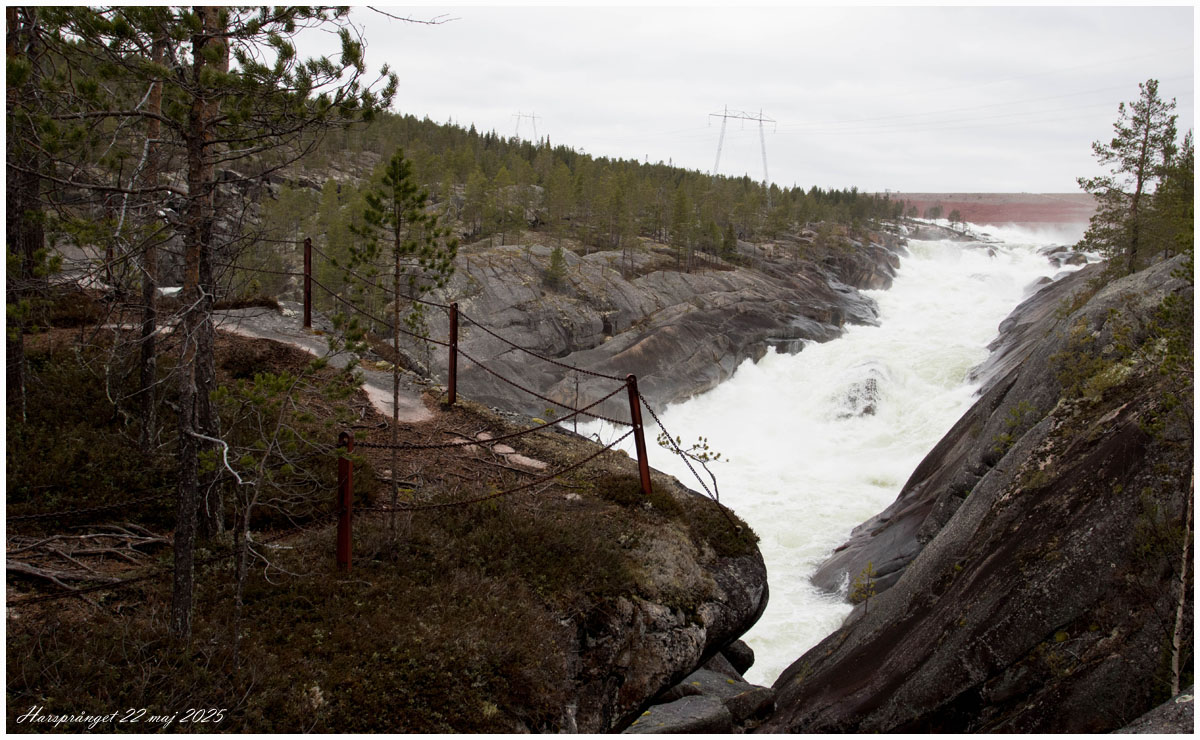 | Harsprångets kraftstation ligger närmast nedanför Porjus. Här har man byggt trappor av trä så folk kan se vattenfallet, | |
