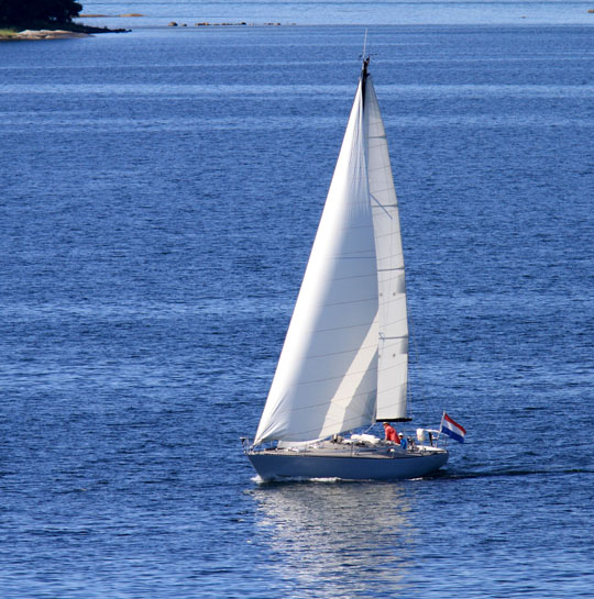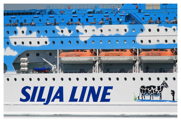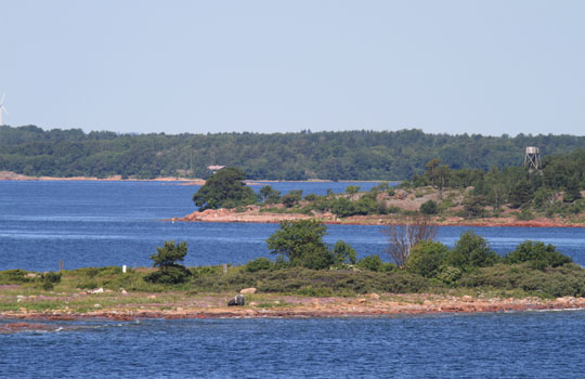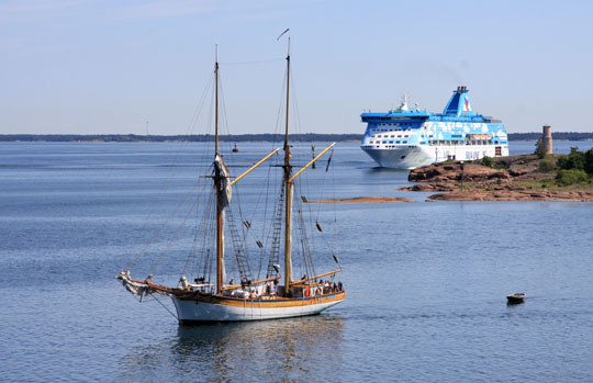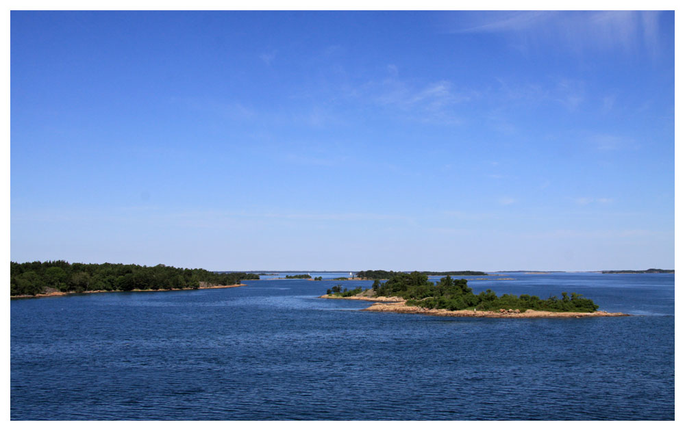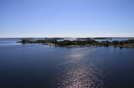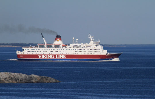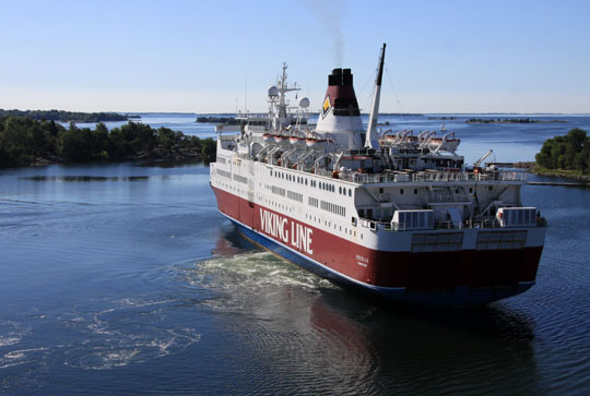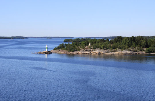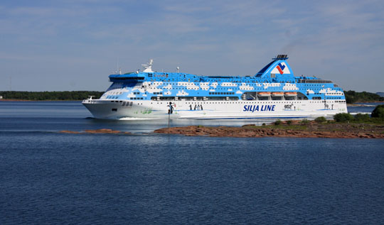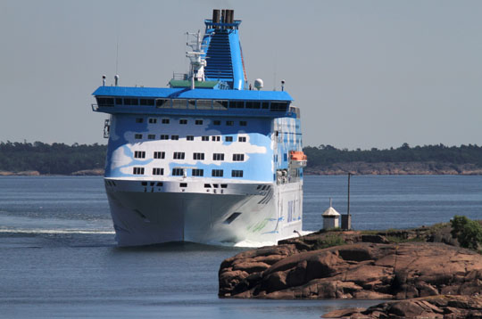 | Söder om Mariehamn går färjeleden genom en mycket trång passage. Här är det Galaxy från Silja line som passerar sundet. |