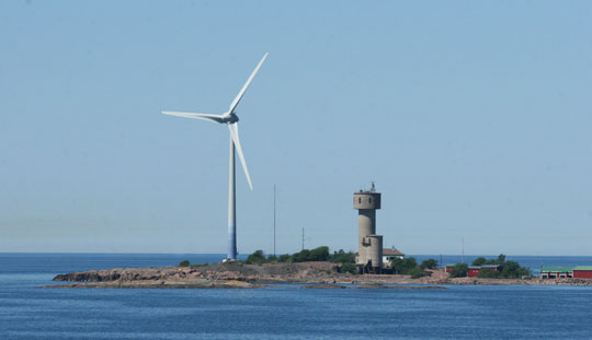 | Ålands sydvästligaste del med vindkraftverk. Det finns ytterligare tre kraftverk på skäret intill. |