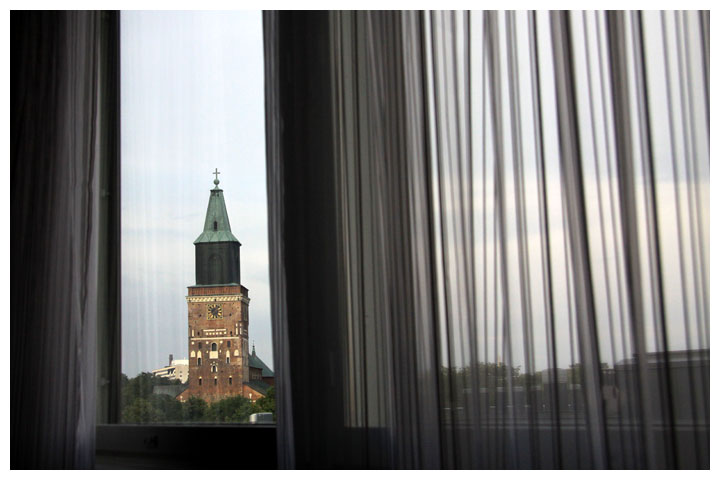 Senare på dagen checkade vi in på ett hotell i centrala Åbo. Från huvudkudden i hotellrummet såg man domkyrkan. |