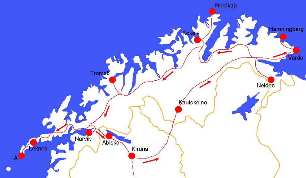 Resan startade med flyg till Kiruna från Ronneby. Med hyrbil reste vi dagen därpå via Vittangi och Karesuando till Kautokeino. Efter övernattning kom vi via Karasjokk till Vardö där vi bodde en vecka. Dagarna användes till utflykter på Varangerhalvön och till Neiden nära Kirkenes. Efter två nätter i Kokelv med besök på Nordkap fortsatte vi till Tromsö. Här levde vi lite stadsliv med konsert i kyrkan och besök på Tromsö museum. Vi använde också gott om tid vid Prestavannet, en liten sjö som hyser smålommar och tärnor helt nära bebyggelsen. Nästa etapp på resan var Lofoten med tre övernattningar. Avslutningsvis bodde vi fyra nätter i Katterjokk med två besök i Abisko. Den 10 juli lämnade vi tillbaka hyrbilen och återvände hem med flyg. |