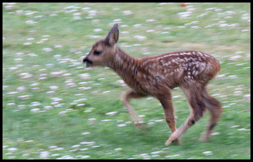 | Rådjurskid på gräsmattan intill huset. Det använde hela tiden ett läte som för tankarna till kattuggleungar eller sjungande sparvuggla. Klicka här för att lyssna på ljudet. |