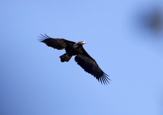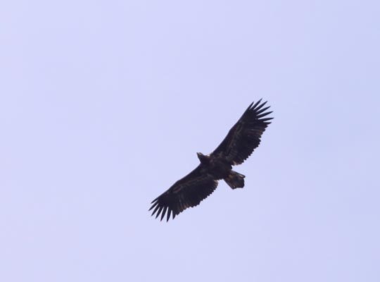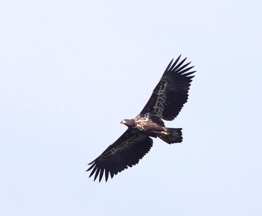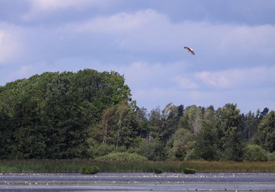 | 8 augusti. Havsörnarna har fått ut en unge i år och den tar sig nu flygturer lite hit och dit i omgivningarna. Idag kom den riktigt nära stället där jag gjort mig så osynlig som möjlig. |