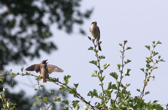 | 9 augusti. Fikapaus hemma i trädgården! Då är det säkrast att ha kameran med, det har jag lärt mig. En familj törnskator kom förbi. En ungfågel tigger mat av hannen. |