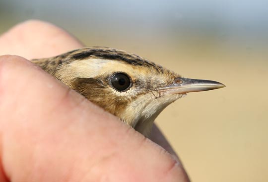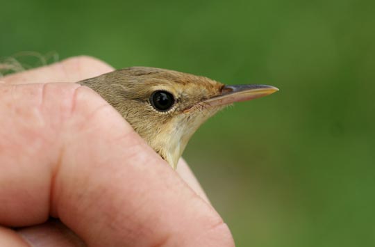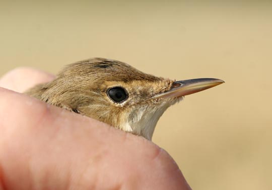 | Annars är det förstås ringmärkning som tar mest tid i anspråk. Idag var det premiär för märkplatsen vid Djurle våtmark för mig. Det blev några tiotal fåglar, mest rörsångare (t h) och sävsångare (nedan). Jämför gärna rörsångarens profil med kärrsångarens (se 10 augusti). Det är svårt att se nån skillnad men rörsångaren ska ha längre näbb! |