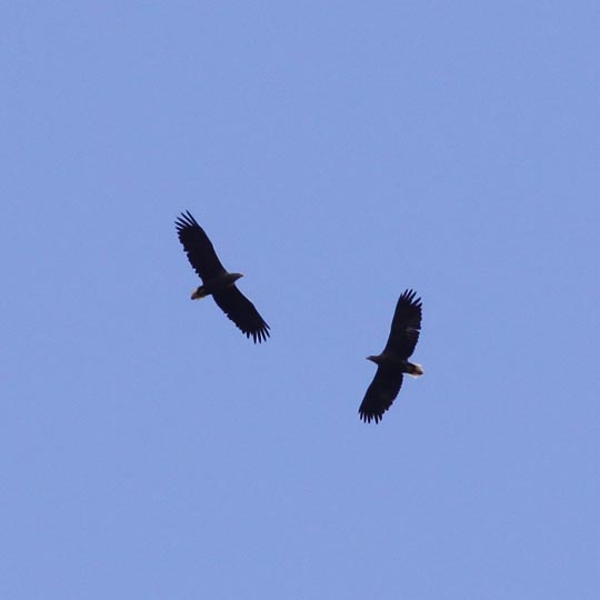 | I morse var det fågelskådning några timmar. De här havsörnarna skruvade mot den blå himmelen. Lite väl stort avstånd men ändå hyfsad kvalitet trots den kraftiga beskärningen av originalet. |