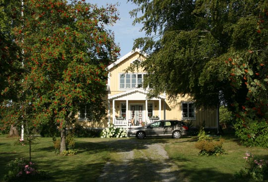 bilder på huset i morgonljus. Två tredjedelar av östra fasaden är nymålad.