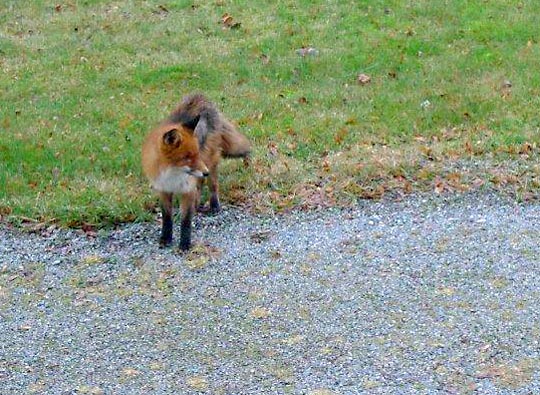 köksfönstret. Räven kom promenerande på tomten när hon höll på med