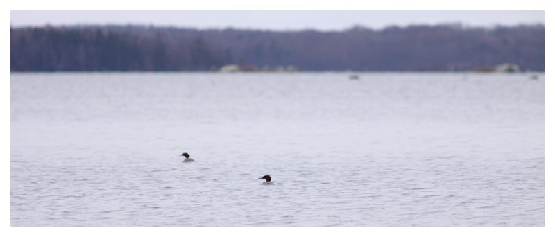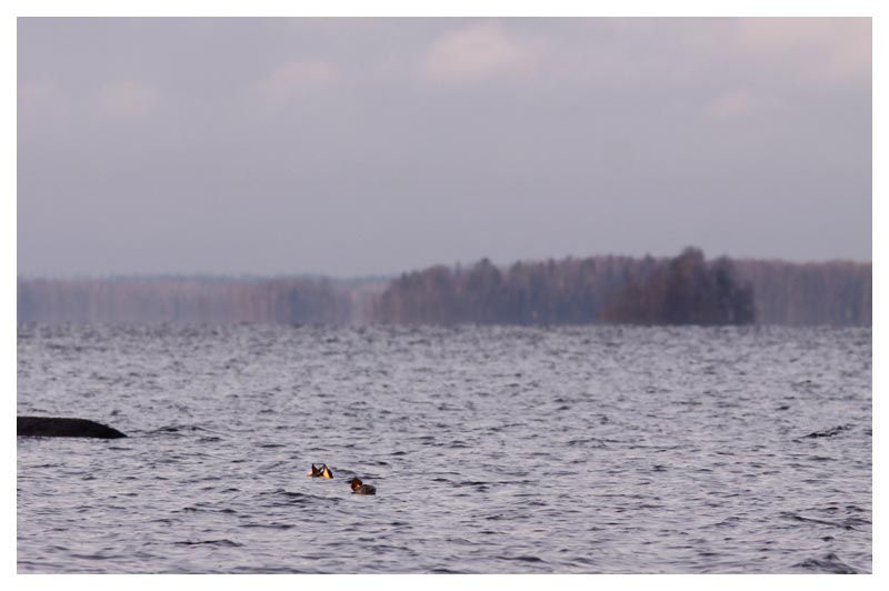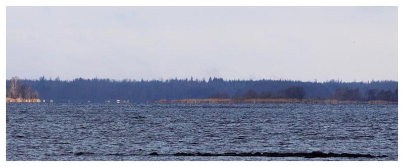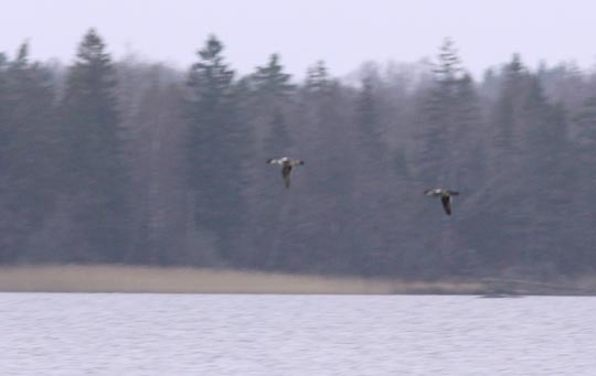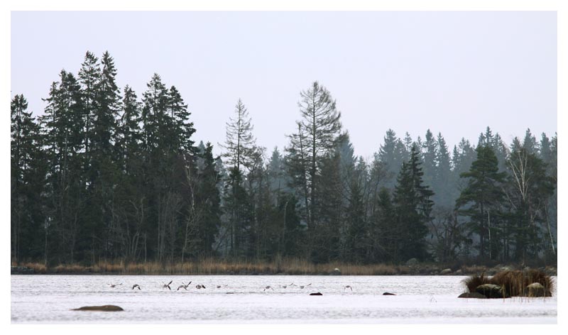 | Som sagt, decemberljuset underlättar inte fotograferandet, speciellt inte då två salskrakar snabbt passerar förbi. Men bilden fångar ändå en typisk upplevelse vid Åsnen vid den här årstiden. |