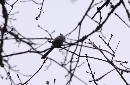 Lunnabacken. Grått väder som vanligt och nästan inget ljus. Stjärtmes sågs som så ofta längs Åsnens lövskogsklädda stränder. Havsörn i en grantopp, uppe till vänster, på Grytö med flygande storskrakar hitom (nedan). |