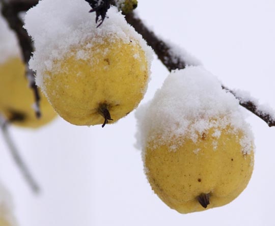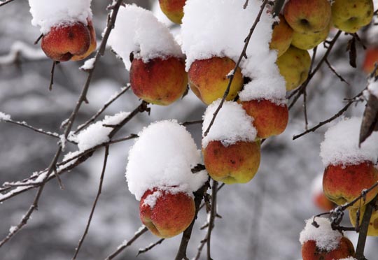 Full vinter med ca 10 cm snö och under 10 grader kallt i morse. Äpplena