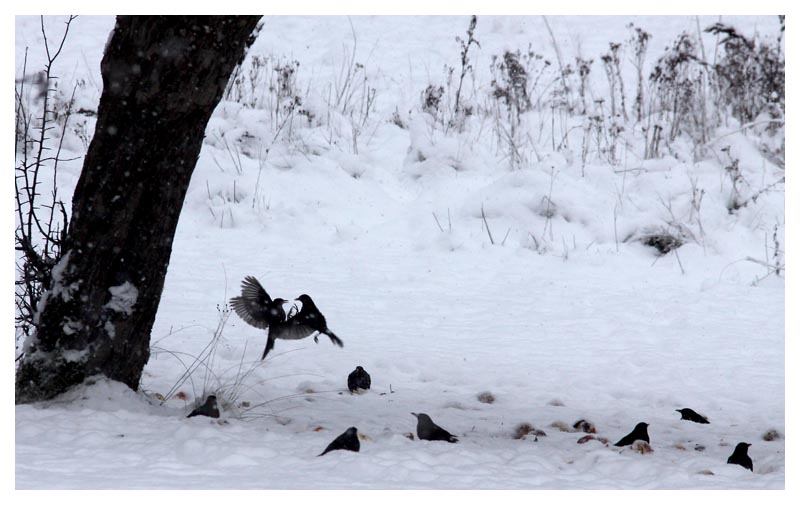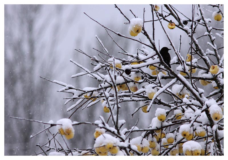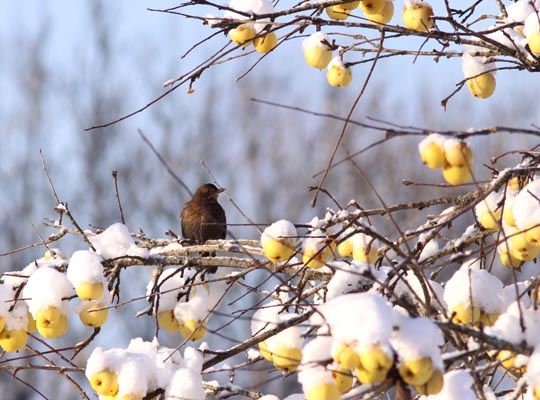 Snön kom precis som SMHI utlovat. I äppleträdet med de vackra gula äpplena trivs koltrastarna. |
