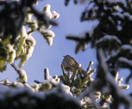 | Under dagens fotorunda sågs flera dubbeltrastar. Den här slog till i en grantopp vid Grimsvik. |
