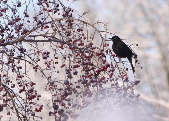 | Hemma vid huset finns hur många koltrastar som helst. De gör som den här, käkar hagtornsbär. |