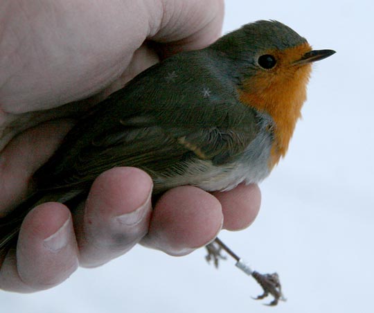 alltid verkade vara helt sams. På eftermiddagen upptäckte jag en rödhake inne i lagårn. Jag lyckades fånga den med händerna. Tidigare på dagen såg vi den tillsammans med trastarna under äppleträdet så energi har den säkert fått i sig. Den verkade pigg och rask när jag släppte den. |