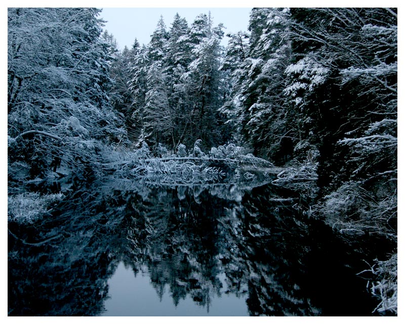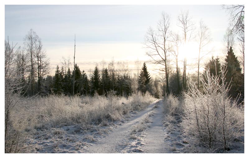| 17 december. Nu närmar sig julen så idag har jag tillverkat julkort. Dagens vackra väder i det snötäckta landskapet gjorde det lätt att hitta julkortsmotiv. Lägger man sedan lite ludd på bilden i Photoshop så blir det riktigt juligt. |