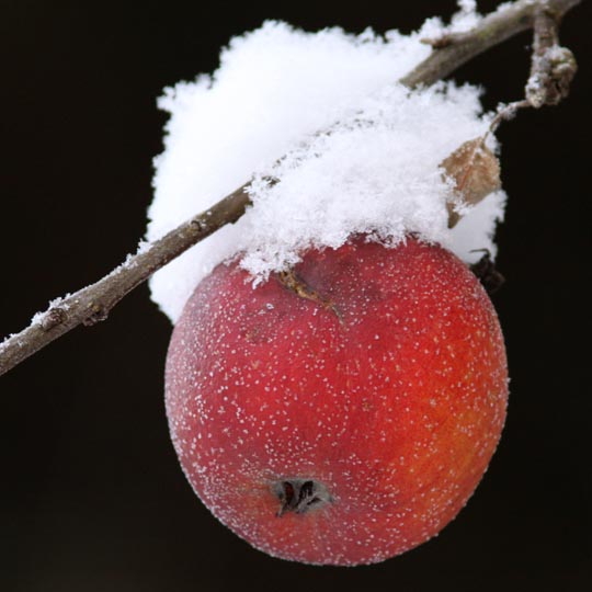 | 21 december. Riktigt kallt och mer snö. De kvarsittande äpplena nere vid Esbjörnamåla är dekorativa. |