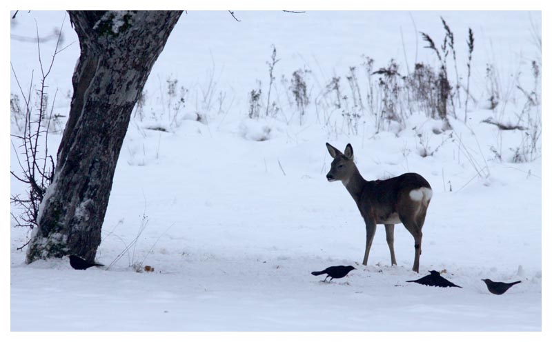 | 23 december. Äpplena på marken under trädet lockar till sig både rådjur och trastar. Idag fanns dessutom två rödhakar på plats, den ena med ring. Det är mildare nu, runt nollan så visst har vi en vit jul på gång. |
