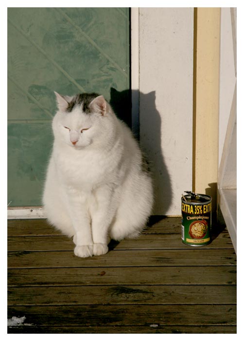 | Året har vänt sedan en dryg vecka och än märks väl ingen skillnad i dagslängd. Men lite extra värme bjöd solen på vid köksdörren vilket Halvan upptäckt. |