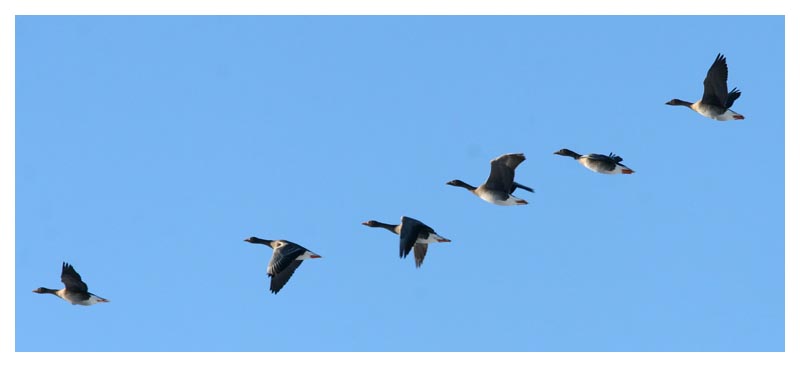 1 januari. Tre sädgäss och tre grågäss. |