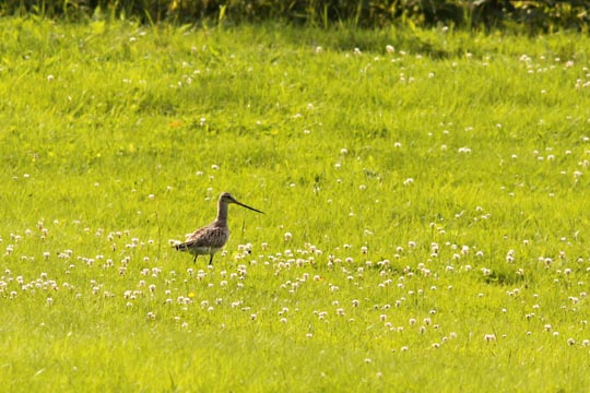 | 22 juli. Vi har varit i Korsberga idag för att se hbur Lovisa har vuxit till sig. Sara berättade då om en långnäbbad fågel hon sett vid granngården. Vi gick dit och hittade då en myrspov. Den har rastat där sedan i söndags. Den letade mat och flög vid störning ner till den angränsande Hjärtsjön. |