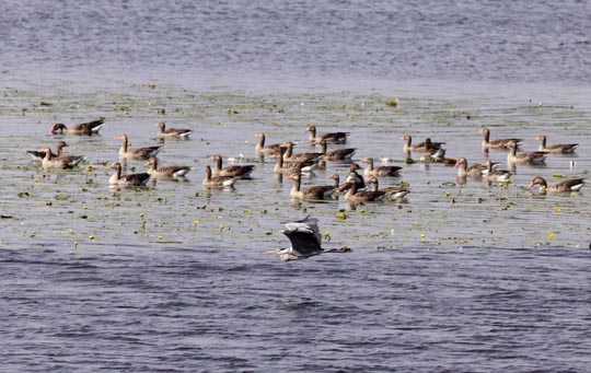 | Efter ringmärkningen blev det någon timme vid Lidhemssjön. Sensommarens grågäss fanns i hundratals, ja troligen tusentals precis som det är varje år nuförtiden. Annat var det på 70-talet då man bara såg några enstaka grågäss då och då. |