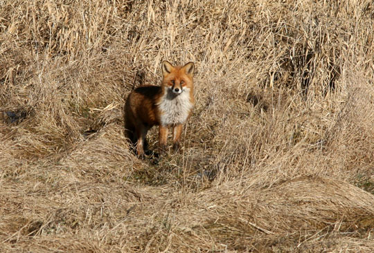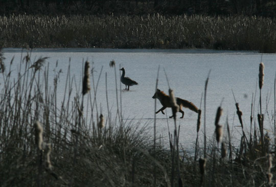 | 19 mars. En räv kom lufsande nedanför berget vid Djurle våtmark. Strax senare tog den en runda ute på isen, noga bevakad av två grågäss. |