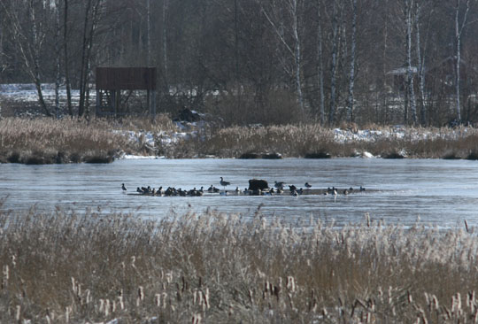 | I onsdags den 25 mars tittade jag till Djurle myr och våtmarken. Strålande sol och minusgrader som fått hela våtmarken att frysa till. Utom i mitten där traktens fåglar trängdes efter bästa förmåga. |