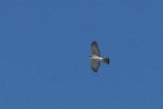 | 25 mars. En sparvhök kretsade nordväst om Djurle våtmark. Sol och snötäckt mark ger ett härligt ljus på hökens undersida. Synd att den inte kom närmre. |