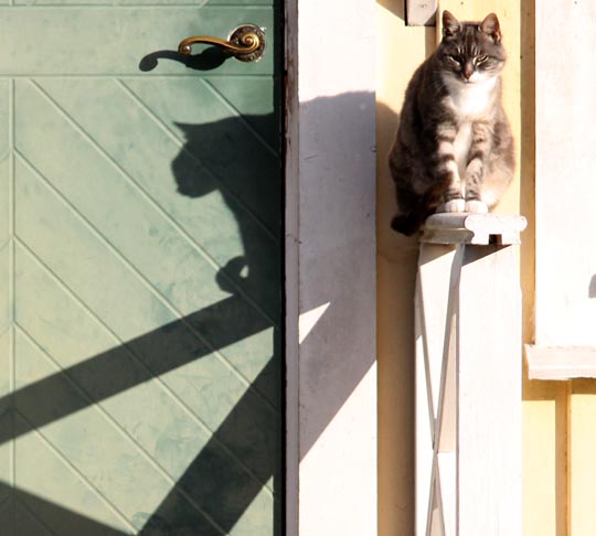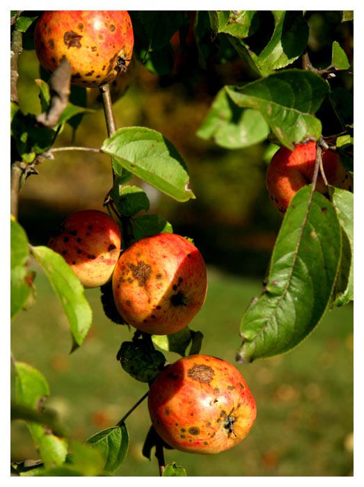 Katten Olga på sin favoritplats utanför köksdörren. Tillgången på äpplen i trädgården är ganska bra men de flesta är fulla med ytskador. Innanför skalet är de dock fina. |