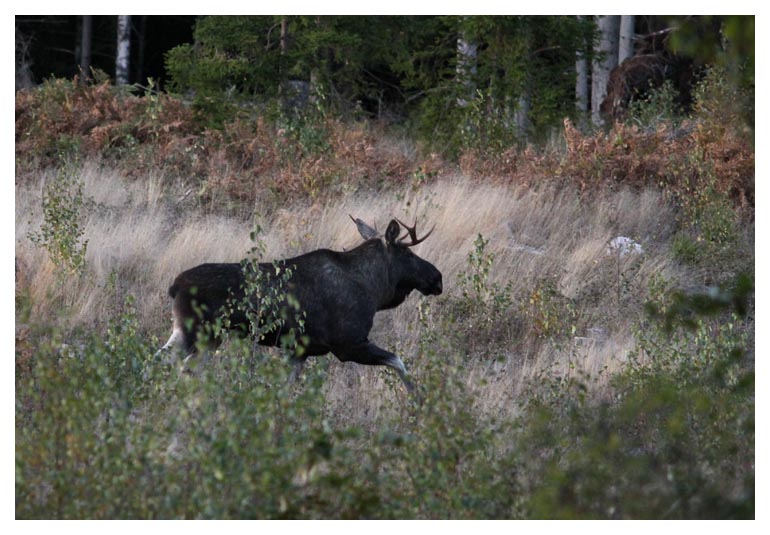 bli allt mörkare på kvällarna, det märks tydligt. Innan dess hade vi sett tre älgar på ett hygge. Det var två tjurar och en ko. På bilden syns den ena tjuren, ett riktigt vackert djur. |