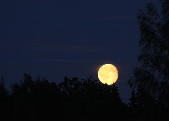 Den nästan fulla månen kom upp över skogskanten strax före sju. Det börjar
