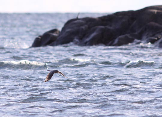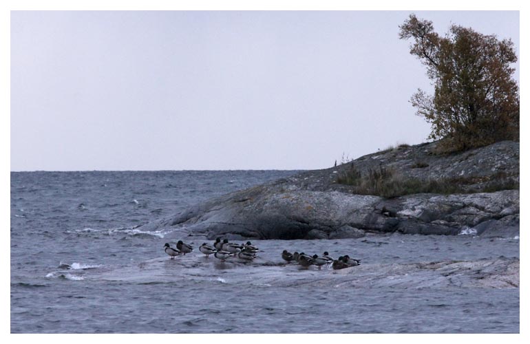 | Väl framme vid fågelstationen blev det skådning nästan direkt förstås. I Gräshålet fanns en flock gräsänder som efter en attack från en subadult havsörn tog sin tillflykt till en berghäll som finns i öppningen ut mot öppet hav. | ||||