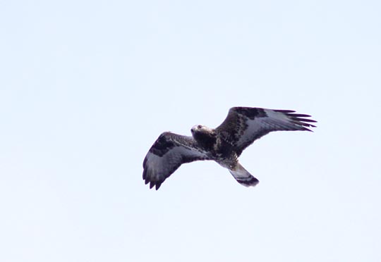 | Antalet sträckande fåglar var också litet. Den här adulta fjällvråken gled rakt över den lilla byggnaden vi bor i. |