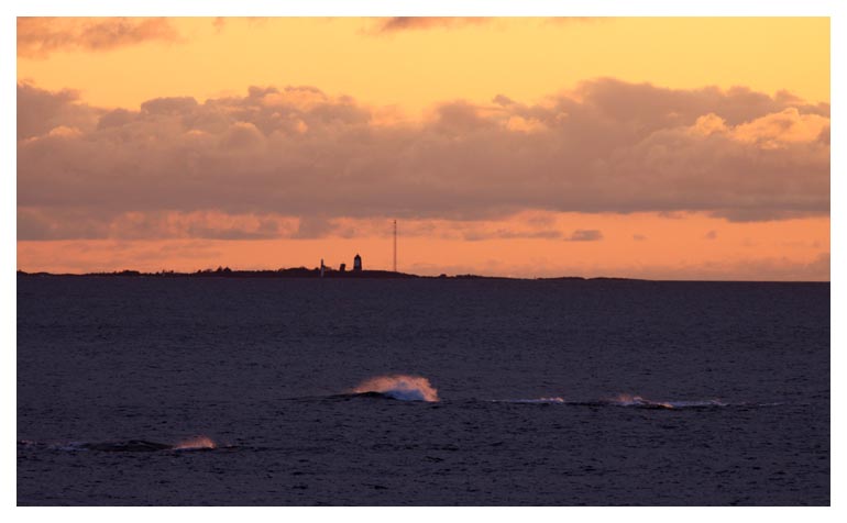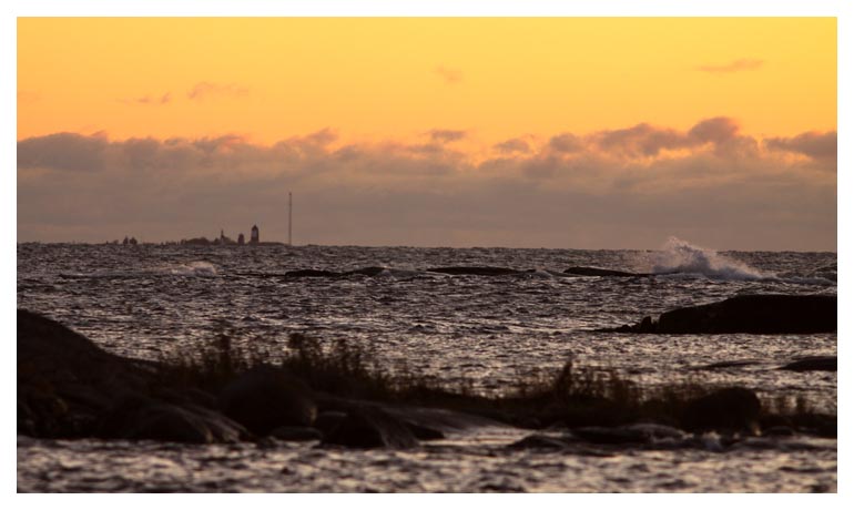 Solen på väg ner på öns västra sida. Hävringe fyr i kvällsljus. |