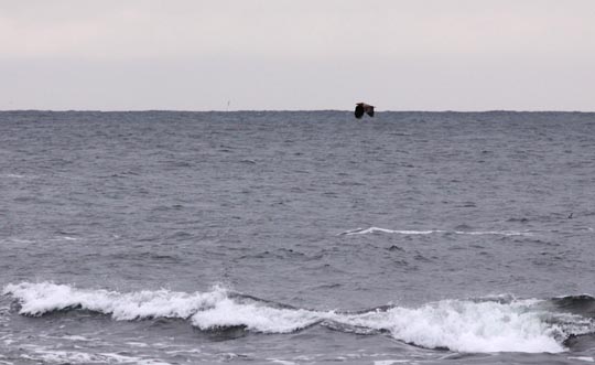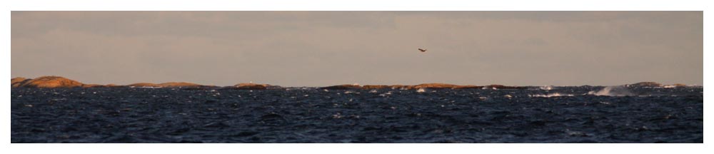 | En havsörn tar sig in mot fastlandet i den hårda motvinden. | ||||