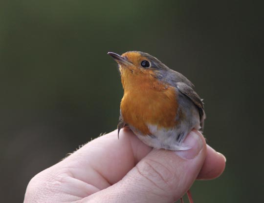 | Rödhaken färdig för att släppas. Framför sig har den en resa ner till södra Europa om den nu inte chansar på att stanna hos oss. Vintrarna tenderar ju bli allt mildare. |