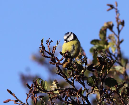 | En flock på över tjugo blåmesar snurrade runt några varv på sydudden. |