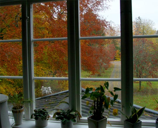 | 24 oktober. Gråväder med regn och tjusiga höstfärger. Boken intill huset är otroligt vacker och full med bokollon. |