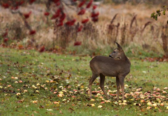 | På morgonen äter ett rådjur av de nedfallna äpplena. Bilden är tagen genom glasrutan men det syns inte. |
