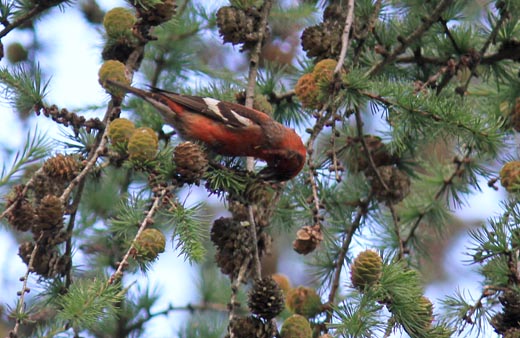 | 1 augusti. Sedan några dagar finns bändelkorsnäbbar i våra trakter. Vi fick tips om några fåglar nära Idemåla. |