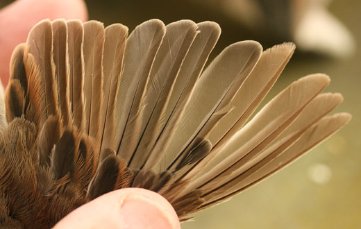 Vinge på en ruggande adult törnsångare. Till höger syns fyra gamla handpennor, i mitten fem nya varav den femte nyss har brutit ut ur fjäderspolen. Längst till vänster syns de två större tertialerna (den tredje, minsta syns inte). Till höger om tertialerna syns fem gamla, slitna armpennor. Den sjätte saknas och har nog tappats helt nyligen. Armtäckarna är gamla eller nya. |