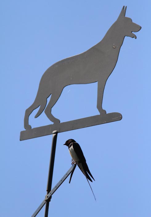 | En ladusvala hade skaffat sig en vakthund av plåt. Vem vet det funkar kanske. |