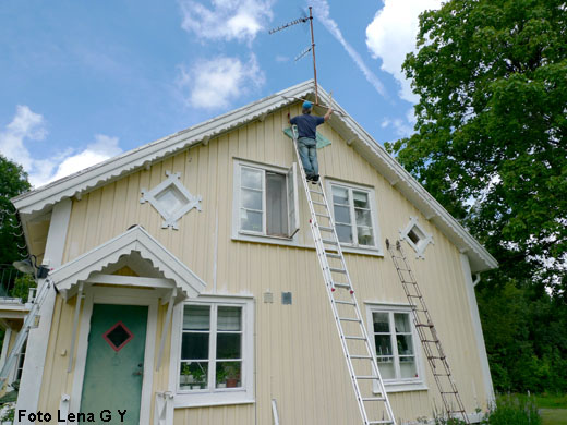 | 7 augusti. Efter semesterresa, dop, födelsedag och besök av vänner har det mesta handlat om husmålning. Det är högt upp till gavelspetsen! |