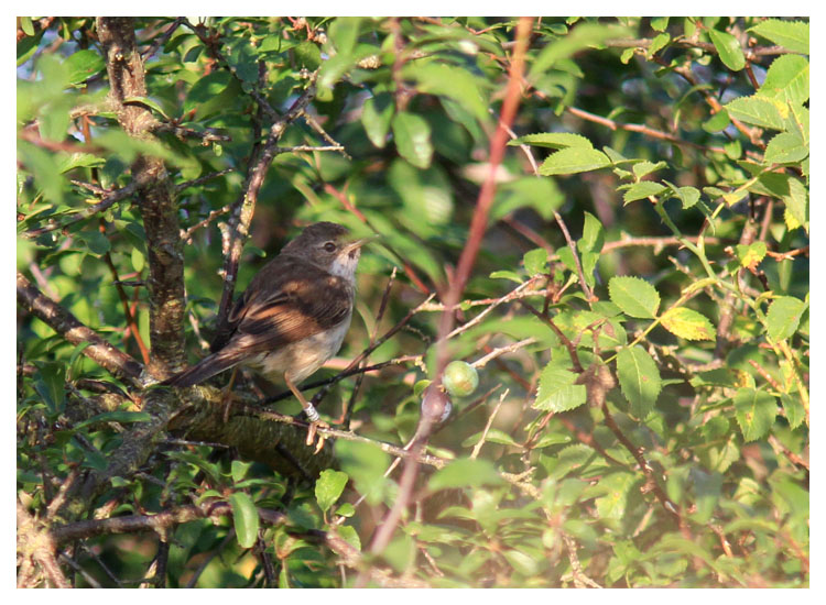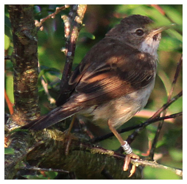 Törnsångaren är ofta svårt att få bilder på där den rör sig inne i buskar och örtvegetation. Observera ringen. Man kan se att det är en gammal fågel som ruggar. Den stora tertialen (armpenna 7) är färdig och fräsch medan andra pennor är blekta och slitna. Den övre är en kraftig delförstoring av originalet där det går att se fräscha och slitna pennor. |