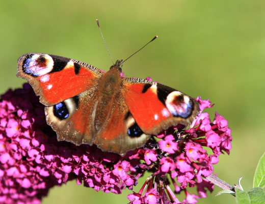 | 20 augusti. Vi skaffade en fjärilsbuske förra. Nu blommar den igen och nässelfjäril och påfågelöga besöker gärna blommorna. |