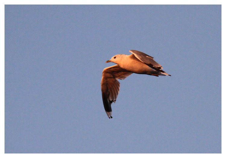 22 augusti. Jag satt längst ute på Ällenäsudde samtidigt som solen gick ner. Den subadulta fiskmåsens vita kroppsundersida blir laxrosa i kvällsljuset. |